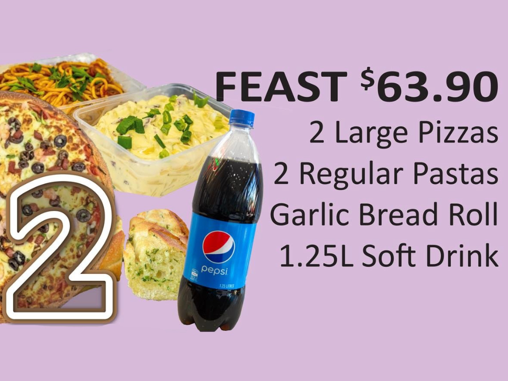 Feast Deal$63.902 large pizzas, 2 regular pastas, garlic bread roll and 1.25l drink