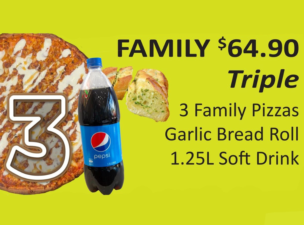 Triple Family Deal$64.903 family pizza, garlic bread roll and 1.25l drink